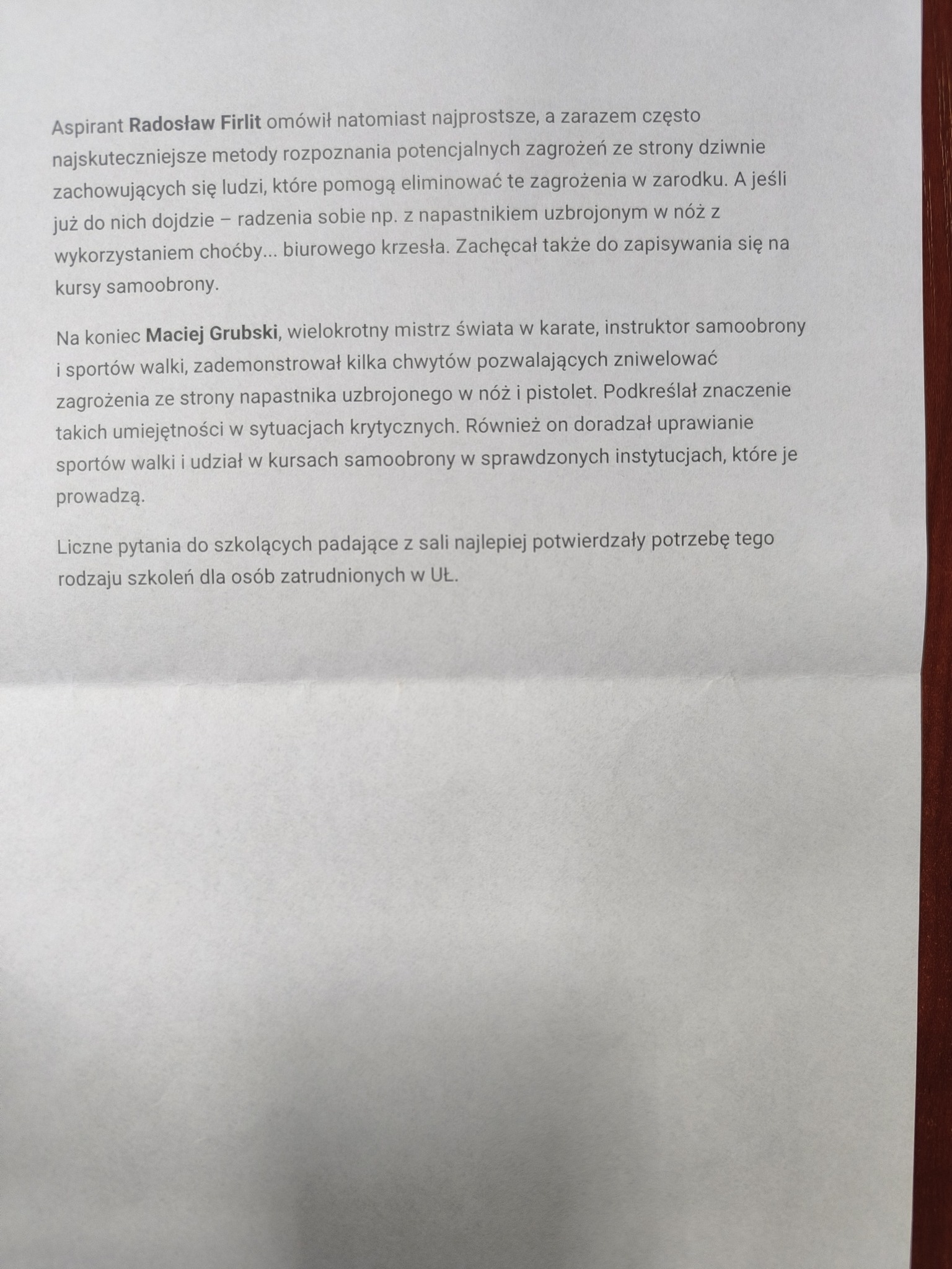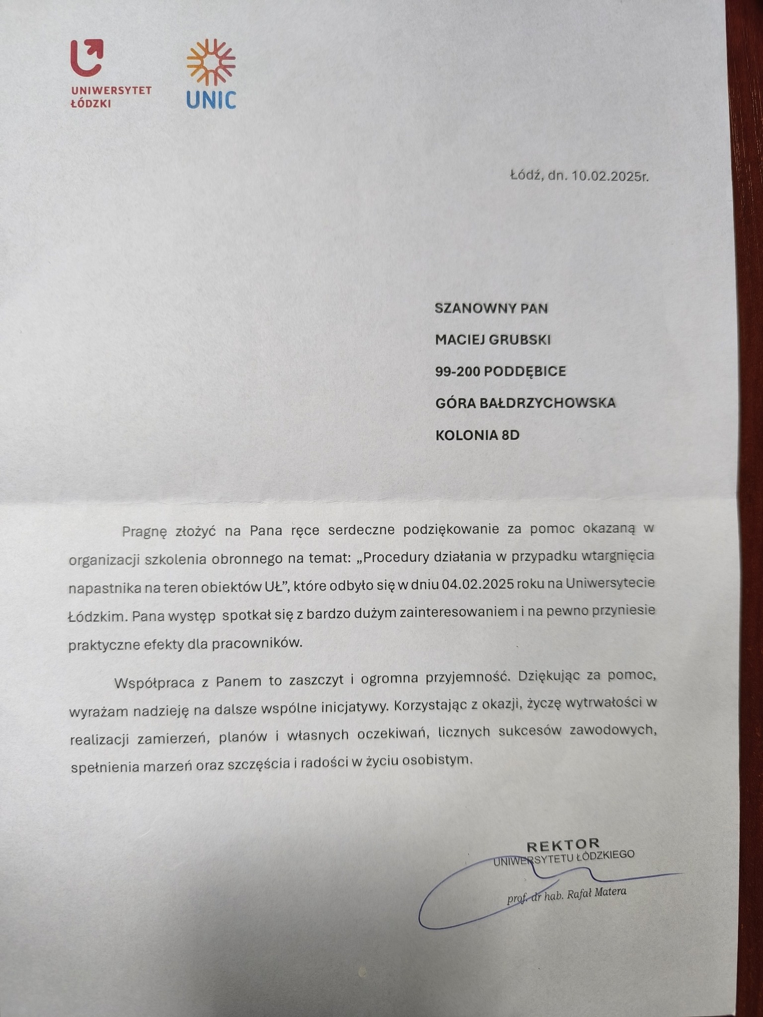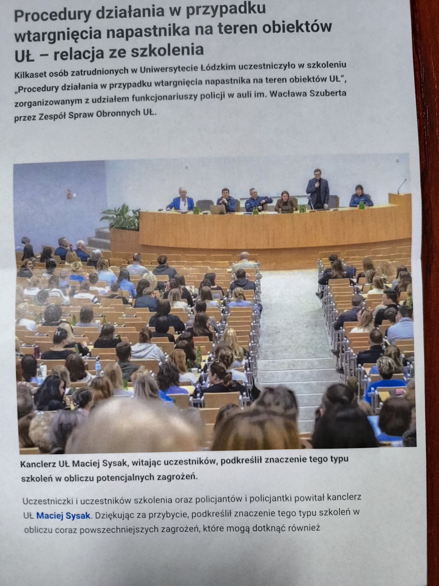 4.02.2025r. miałem zaszczyt i przyjemność wziąć udział w szkoleniu obronnym na temat „Procedury działania w przypadku wtargnięcia napastnika na teren obiektów Uniwersytetu Łódzkiego”. Profesjonalnie przygotowane i niezwykle pożyteczne szkolenie pokazało, jak w dzisiejszych czasach ważne jest bezpieczeństwo. Wszyscy obecni, a była naprawdę bardzo duża frekwencja, aktywnie słuchali i zadawali dużo pytań w temacie bezpieczeństwa i zachowania się w sytuacjach niebezpiecznych i zakładniczych. Osobiście uważam, że takie szkolenia połączone z niewielką chociaż praktyką, powinny być zorganizowane w szkołach, urzędach i instytucjach narażonych na ataki. Dziękuję Panu prof. dr hab. Rafałowi Matera za zaproszenie.
